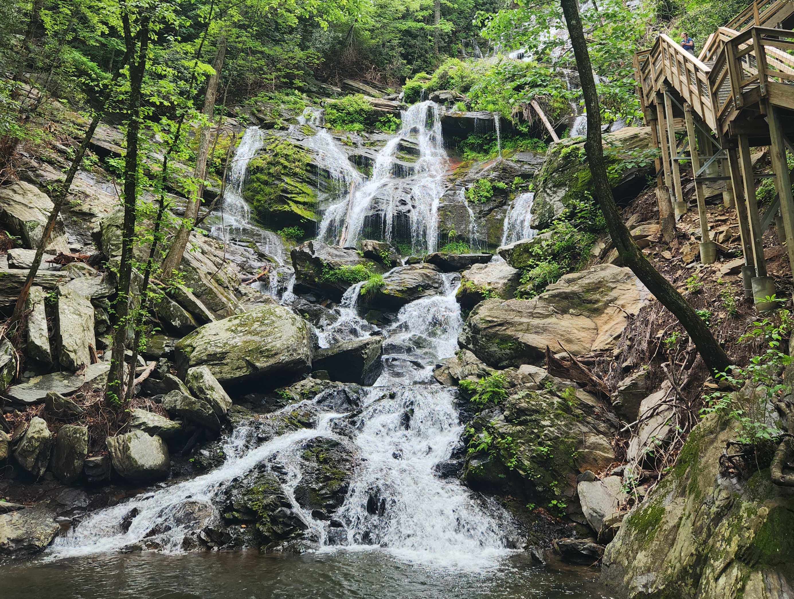 This small group hike meets in downtown Asheville at 8:30am. The guide will review the hike and you'll head to the trailhead (drive time is about 35 minutes). The hike is 3.5 mile round trip on wide, well-graded trails along the Catawba River. This hike visits both Lower Catawba Falls and Upper Catawba Falls. We consider this hike easy-moderate - the trails are easy and non-technical, with a total of 580 stairs to climb between the two falls. The observation tower provides sweeping views of the Blue Ridge Mountains. This area has a wide diversity of wildflowers in the spring and summer, and stunning foliage colors in the fall.